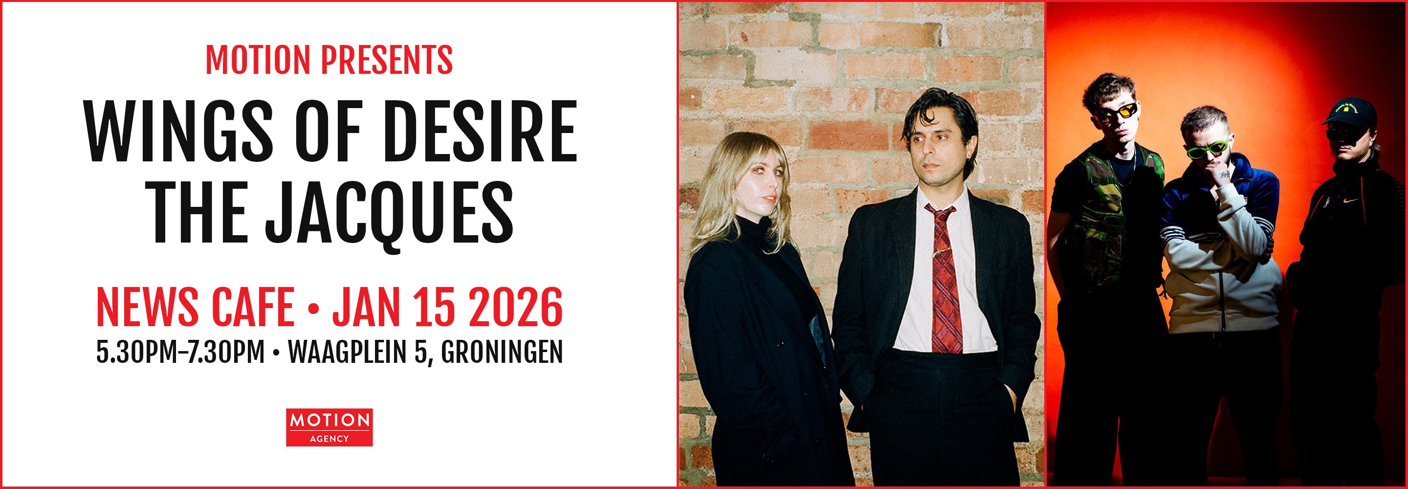 Motion presents a dynamic double bill featuring two of the UK’s most compelling emerging acts: Wings of Desire and The Jacques. Bringing together sharp, melodic indie energy and expansive, art-driven alternative rock, this showcase highlights the breadth of new talent championed by Motion. Both artists have been building strong momentum across the UK and Europe, making this a standout moment to experience their live power up close.